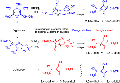 Lenagh-Snow, G. M. J.; Araujo, N.; Jenkinson, S. F.; Martinez, R. F.; Shimada, Y.; Yu, C.-Y.; Kato, A.; Fleet, G. W. J., Azetidine Iminosugars from the Cyclization of 3,5-Di-O-triflates of alpha-Furanosides and of 2,4-Di-O-triflates of beta-Pyranosides Derived from Glucose. Org. Lett. 2012, 14, 2142-2145.
